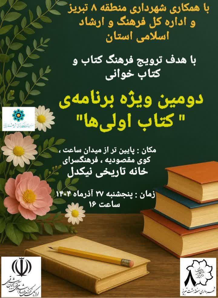 دومین نشست «کتاباولیها» با همکاری واحد فرهنگی و اجتماعی شهرداری منطقه ۸ تبریز و اداره کل فرهنگ و ارشاد اسلامی آذربایجان شرقی در فرهنگسرای تاریخی نیکدل برگزار میشود. به گزارش امور ارتباطات شهرداری منطقه ۸، این برنامه با هدف ترویج فرهنگ مطالعه، تقویت جریان کتابخوانی و حمایت از نویسندگان نوپا برپا خواهد شد.