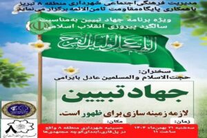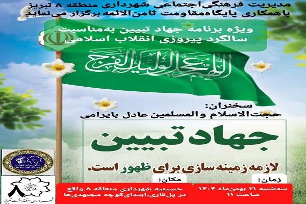 همزمان با چهلوهفتمین سالگرد پیروزی انقلاب اسلامی و در ایام دهه مبارک فجر، ویژهبرنامه «جهاد تبیین» در حسینیه شهرداری منطقه ۸ تبریز برگزار میشود.
