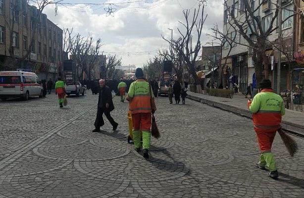 رفت و روب روزانه مسیر تجمع مردمی شهروندان در حمایت از نظام، شهدا و قهرمانان نظامی کشور
